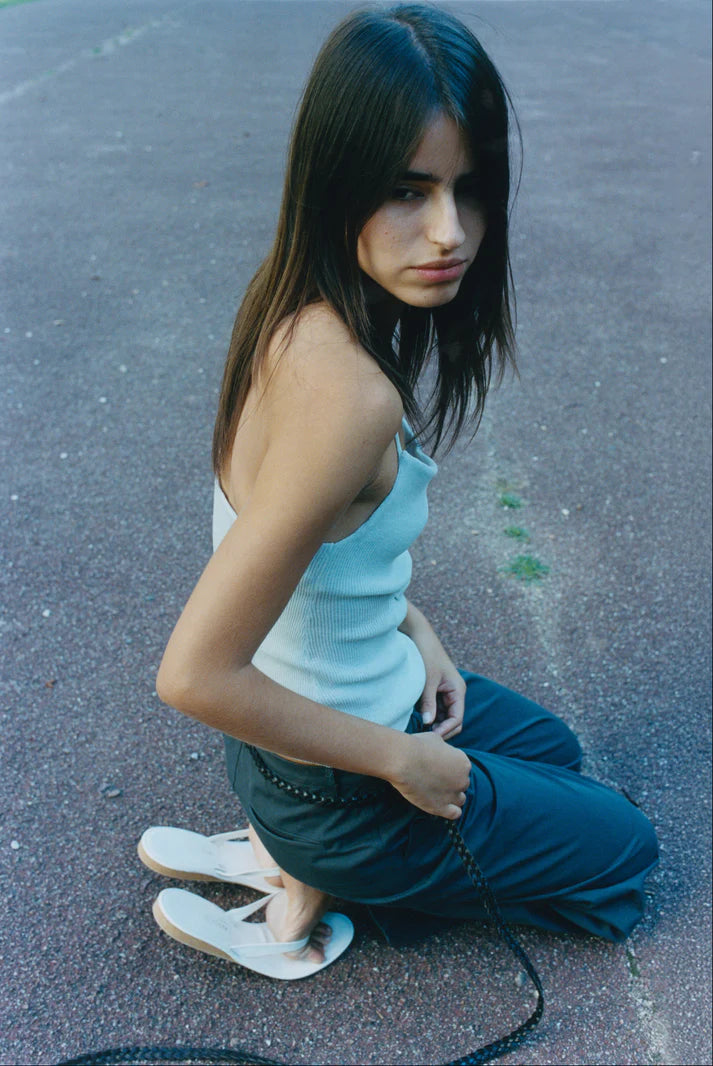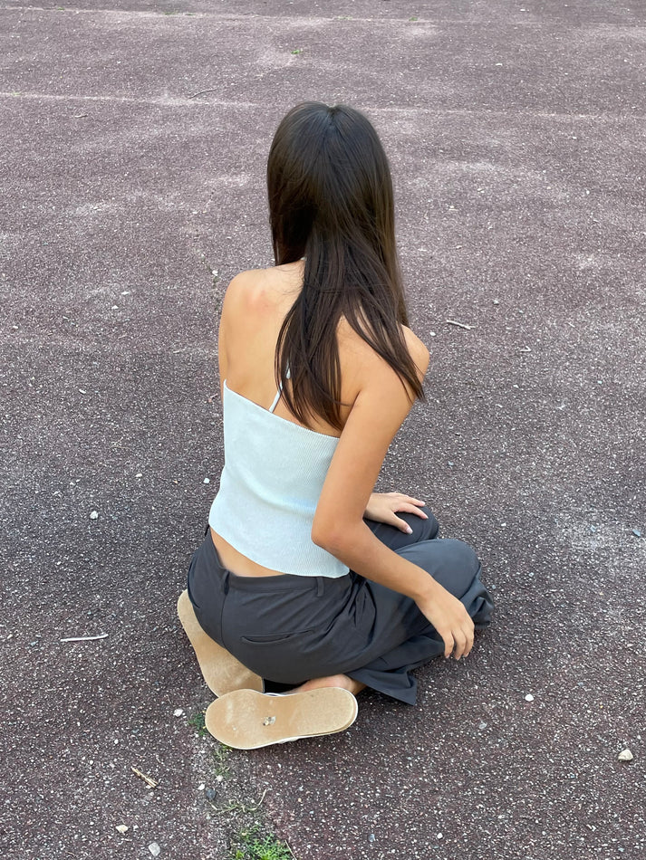 a fine knit halter tank in a tailored fit, featuring a pinched pleat detailing at the front and a low back