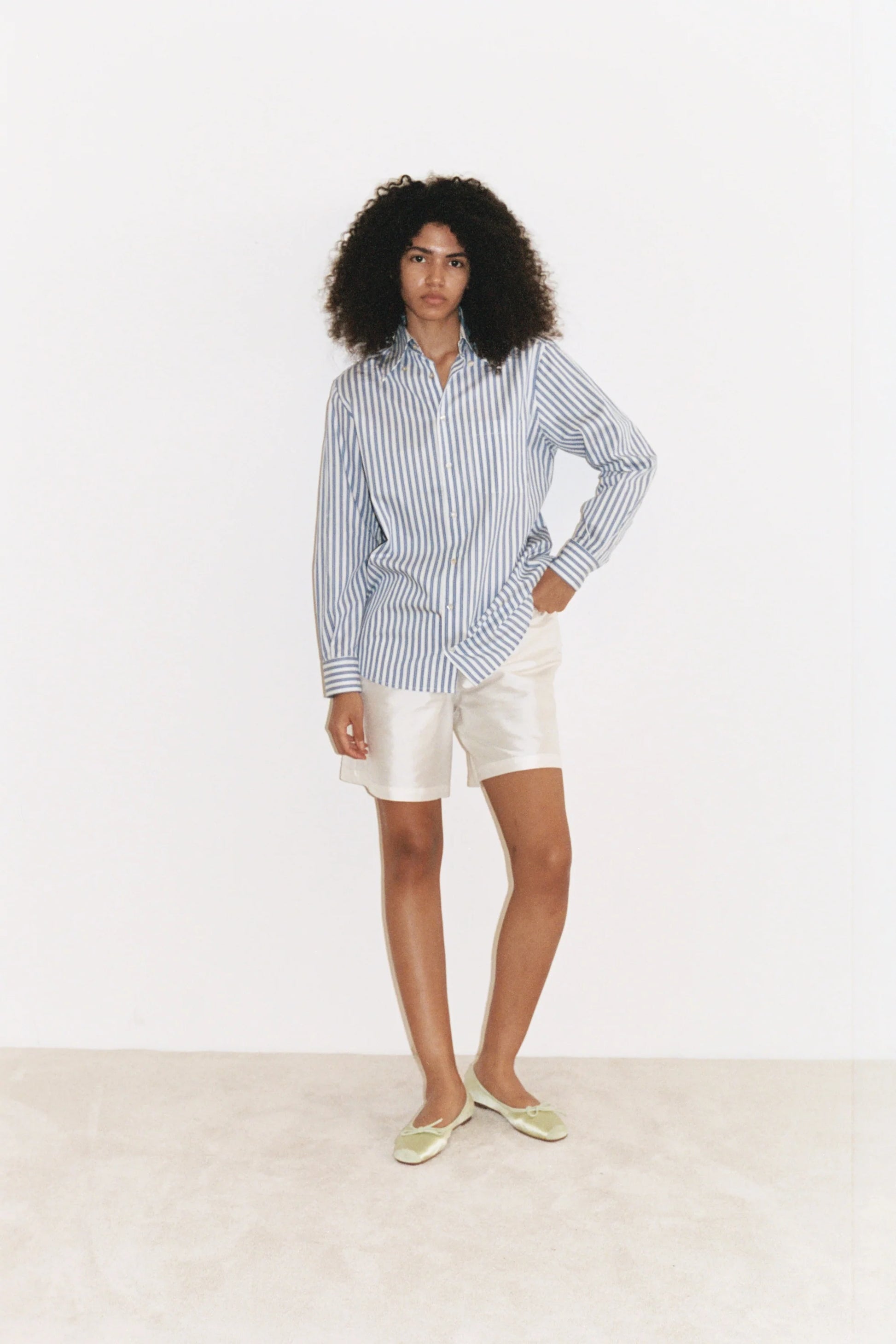 The Adeline shorts in ivory are crafted from dupion silk. They feature an elasticated waistband, and the legs are cut just above the knee.